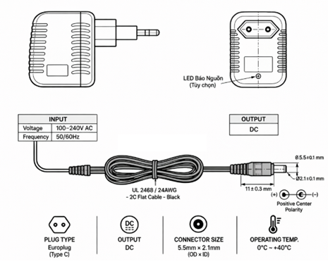 | Loại Đầu Nối | Jack DC 5.5×2.1mm |