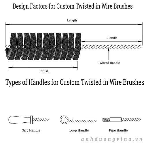 Giá đỡ dây – Đặc trưng bởi thiết kế dây xoắn (được tạo thành từ hai hoặc nhiều dây), chúng tạo ra các sợi xoắn ốc. Bàn chải dây xoắn được sử dụng rộng rãi trong việc làm sạch ống, loại bỏ bavia bên trong và làm sạch chính xác các bộ phận nhỏ cho các ngành công nghiệp như hàng không vũ trụ, ô tô và điện tử. Sự kết hợp vô tận giữa vật liệu sợi, kích thước và cấu hình làm cho bàn chải dây trở nên rất linh hoạt cho các ứng dụng tùy chỉnh.