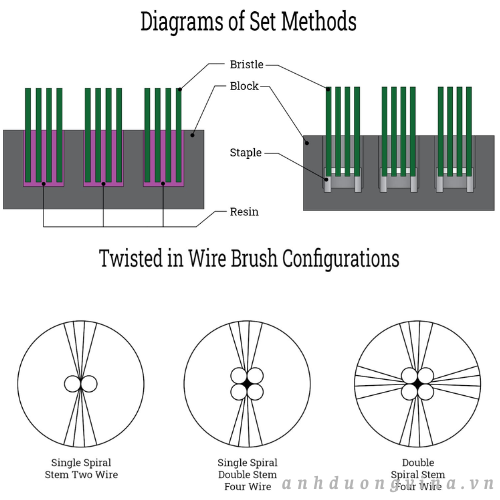Ba trong số những phương pháp phổ biến nhất để gắn các sợi lông vào cán bàn chải bao gồm phương pháp xoắn dây, phương pháp đóng ghim và phương pháp lắp ráp bàn chải dạng dải. Việc lựa chọn quy trình sản xuất tối ưu phụ thuộc vào mục đích sử dụng bàn chải – từ việc loại bỏ bavia tốc độ cao trong sản xuất ô tô đến xử lý bề mặt tinh tế trong lĩnh vực điện tử hoặc môi trường phòng thí nghiệm.