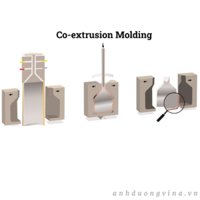 Kỹ thuật này tạo ra các chai nhiều lớp bằng cách ép đùn đồng thời nhiều lớp nhựa vào một phôi, sau đó các lớp này sẽ kết dính lại với nhau tạo thành sản phẩm cuối cùng. Phương pháp ép đùn đồng thời cho phép tạo ra các lớp hoàn thiện bề ngoài sáng tạo, chẳng hạn như hiệu ứng mờ mềm mại mà không cần lớp phủ bổ sung, hoặc sử dụng vật liệu tái chế sau tiêu dùng (PCR) ở bên ngoài trong khi vẫn bảo vệ chất lỏng bên trong bằng nhựa nguyên sinh. Nó cũng tăng cường khả năng chắn khí của chai, tương tự như các phương pháp sản xuất chai dạng tuýp.