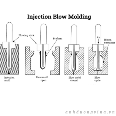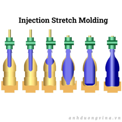 - Ở giai đoạn đầu tiên, nhựa nóng chảy được tạo hình thành phôi, sau đó được nung nóng lại, kéo giãn và thổi thành hình dạng mong muốn bằng quy trình ép phun hai bước.