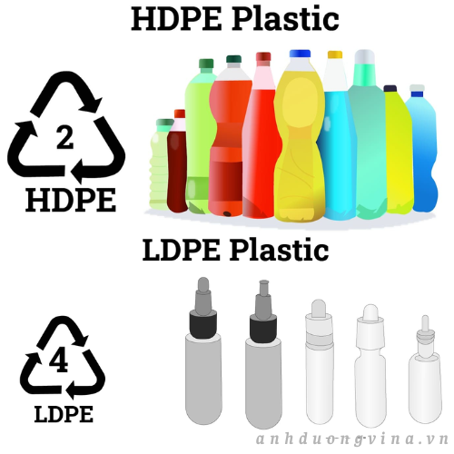 - HDPE (Polyethylene mật độ cao) là một loại nhựa mờ đục thường thấy trong các chai đựng bột giặt và sữa. Hầu hết chúng đều có thể tái chế.