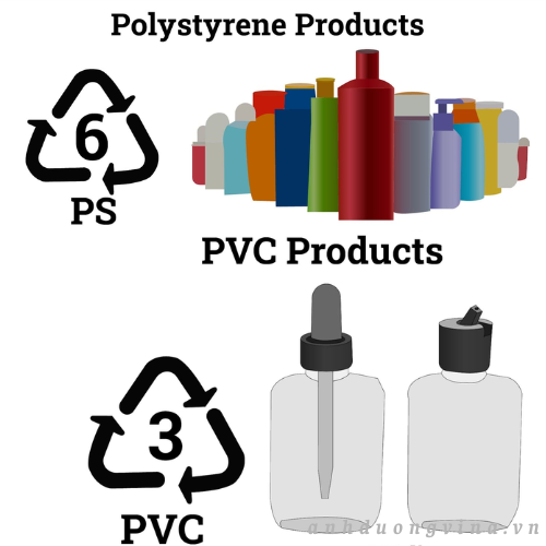 - PVC (Polyvinyl Chloride) được tìm thấy trong ống nhựa, màng bọc co nhiệt.