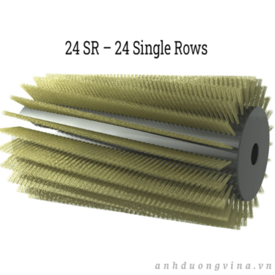 24 SR – 24 Hàng đơn: Chổi quét hình trụ 24 hàng đơn (24 SR) có 24 búi hoặc cụm sợi chổi bền chắc được sắp xếp liền mạch xung quanh đường kính của nó, còn được gọi là kiểu “lấp đầy”. Chổi quét công nghiệp này rất hiệu quả trong việc quét, chà rửa và giữ lại lượng lớn các mảnh vụn mịn như bụi, cát, muội than và các chất gây ô nhiễm dạng hạt nhỏ tương tự. Tuy nhiên, do mật độ sợi chổi dày đặc, chổi 24 hàng kém hiệu quả hơn trong việc thu gom các mảnh vụn lớn, cồng kềnh thường thấy trong các hoạt động làm sạch thương mại hoặc đô thị. Tuổi thọ và hiệu suất hoạt động của chổi công nghiệp 24 hàng chủ yếu phụ thuộc vào tần suất và điều kiện sử dụng – có nghĩa là tuổi thọ không chỉ phụ thuộc vào số lượng lông chổi. Trong các trường hợp sử dụng tương đương, kiểu chổi 24 hàng mật độ cao sẽ có tuổi thọ tương đương với chổi 6 hàng hoặc 8 hàng. Điều này làm cho nó lý tưởng cho các ứng dụng ưu tiên loại bỏ các hạt mịn, chẳng hạn như sàn nhà máy sản xuất, kiểm soát bụi đường và môi trường làm sạch kỹ thuật.