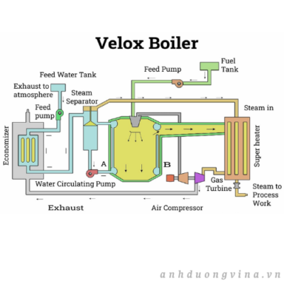 Nước nóng và hơi nước tạo thành được tách ra trong bộ tách nước chuyên dụng, sau đó được xử lý tiếp trong bộ siêu nhiệt sử dụng khí thải. Khả năng đáp ứng nhanh chóng với sự thay đổi tải, kích thước nhỏ gọn và khả năng tạo ra hơi nước áp suất cao, nhiệt độ cao khiến nồi hơi Velox phù hợp với các nhà máy đồng phát điện công nghiệp, sản xuất hóa chất và các địa điểm yêu cầu cung cấp hơi nước hiệu quả, tốc độ cao.