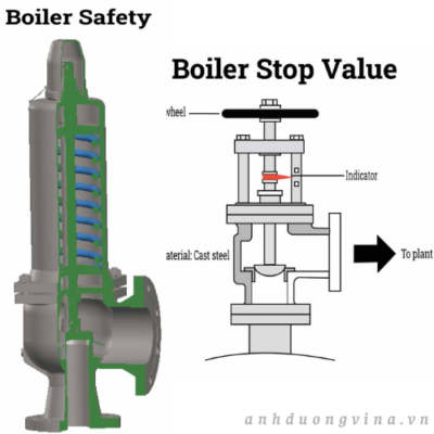 Van an toàn bảo vệ nồi hơi bằng cách xả hơi nước khi áp suất bên trong vượt quá mức an toàn, ngăn ngừa nguy cơ quá áp. Nó giúp kiểm soát áp suất cực đại bằng cách xả hơi nước dư thừa, và tiếng xả lớn của nó đóng vai trò như một cảnh báo bằng âm thanh cho những người ở gần đó. Các loại van an toàn phổ biến bao gồm van tay gạt, van trọng lượng chết, van hơi cao – nước thấp và van lò xo (như minh họa bên dưới).