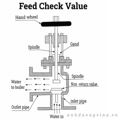 Van một chiều điều chỉnh lưu lượng nước chảy vào nồi hơi và ngăn nước chảy ngược trở lại nếu bơm bị hỏng hoặc áp suất không đủ. Còn được gọi là van không hồi lưu, nó được lắp đặt ngay dưới mực nước trong nồi hơi.