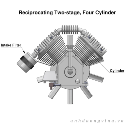 Máy nén khí trang bị nhiều piston hoạt động theo chu kỳ thay vì chạy liên tục, giúp giảm thiểu nguy cơ quá nhiệt và kéo dài tuổi thọ máy. Hệ thống làm mát bằng khí hiệu quả, thường thông qua các đầu tản nhiệt, giúp tản nhiệt trong quá trình hoạt động, giảm chi phí năng lượng và đảm bảo hiệu suất ổn định trong suốt ca làm việc kéo dài.