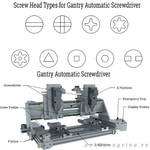 - Hệ thống vặn vít tự động là hệ thống siết vít tiên tiến về mặt công nghệ, sử dụng bộ phận cấp vít, bộ điều khiển và bộ phận vặn vít để lắp và siết chặt vít vào phôi.