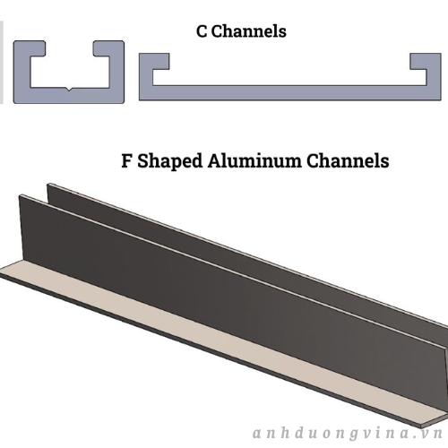 Một dạng phổ biến khác là thanh chữ C hình chữ U, bao gồm một thân và hai mặt bích, đôi khi có phần đỉnh uốn cong vào trong để lắp đặt đai ốc – một kỹ thuật phổ biến trong các hệ thống khung mô-đun và kết cấu điều chỉnh được. Kích thước tùy chỉnh về chiều rộng thân và chiều dài mặt bích, cùng với nhiều loại hoàn thiện khác nhau bao gồm mạ anod, chải hoặc sơn tĩnh điện, giúp tăng tính hữu dụng và vẻ đẹp thẩm mỹ, như được minh họa trong các hình ảnh bên dưới.