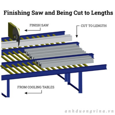 Sau khi các sản phẩm đùn nguội đến nhiệt độ phòng, chúng được cắt thành các chiều dài cần thiết bằng cưa hoàn thiện, thường là cưa tròn.