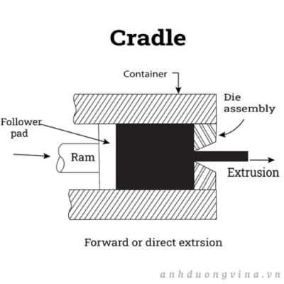 - Ép đùn tác động thuận – Trong phương pháp ép đùn tác động thuận, phôi được đẩy vào khuôn, tạo hình theo khuôn chỉ trong một chuyển động mạnh mẽ duy nhất.