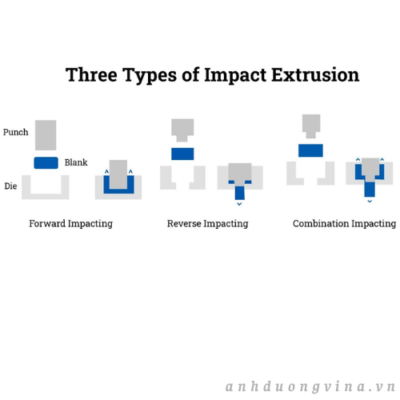 - Ép đùn tác động ngược – Trong kỹ thuật này, phôi sẽ có hình dạng của khuôn đột, khiến nhôm chảy xung quanh khuôn đột, thích hợp cho các ứng dụng như xi lanh hoặc ống liền mạch.