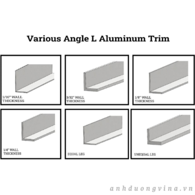 Nẹp góc bằng nhôm có nhiều cấu hình khác nhau, bao gồm độ dày thành khác nhau, từ 1/16 inch đến 1/4 inch (0,36 cm đến 0,64 cm). Ngoài ra, chiều dài các cạnh có thể bằng nhau hoặc không bằng nhau, tùy thuộc vào yêu cầu cụ thể.
