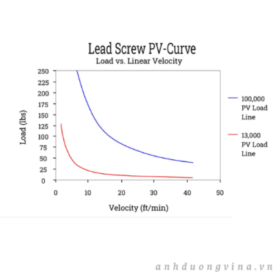 Đường cong PV phác thảo các giới hạn hoạt động an toàn cho vít me, minh họa mối quan hệ nghịch đảo giữa áp suất bề mặt tiếp xúc và vận tốc trượt để đảm bảo hoạt động an toàn. Khi xử lý tải trọng trục lớn hơn, nên giảm tốc độ quay của vít me. Nguyên tắc này nên được áp dụng bất cứ khi nào điều chỉnh tải trọng trục hoặc tốc độ quay.